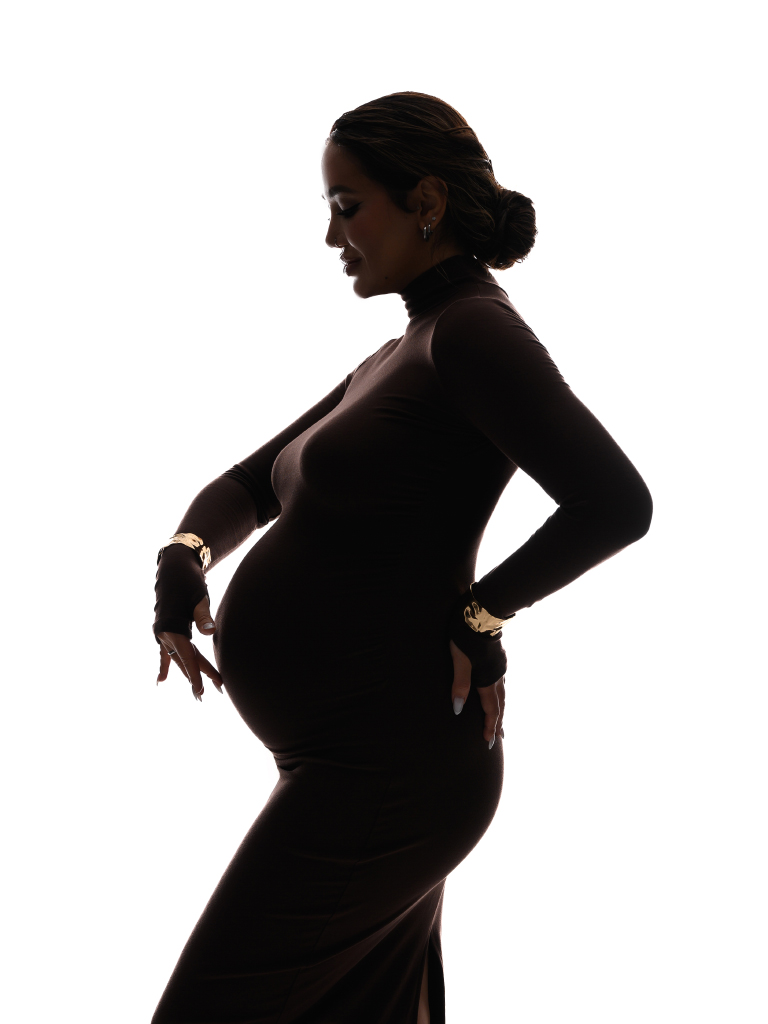 Третий образ-красивый силуэт берменной жнщины на белом фоне. С низким пучком волос и облегающем платье.