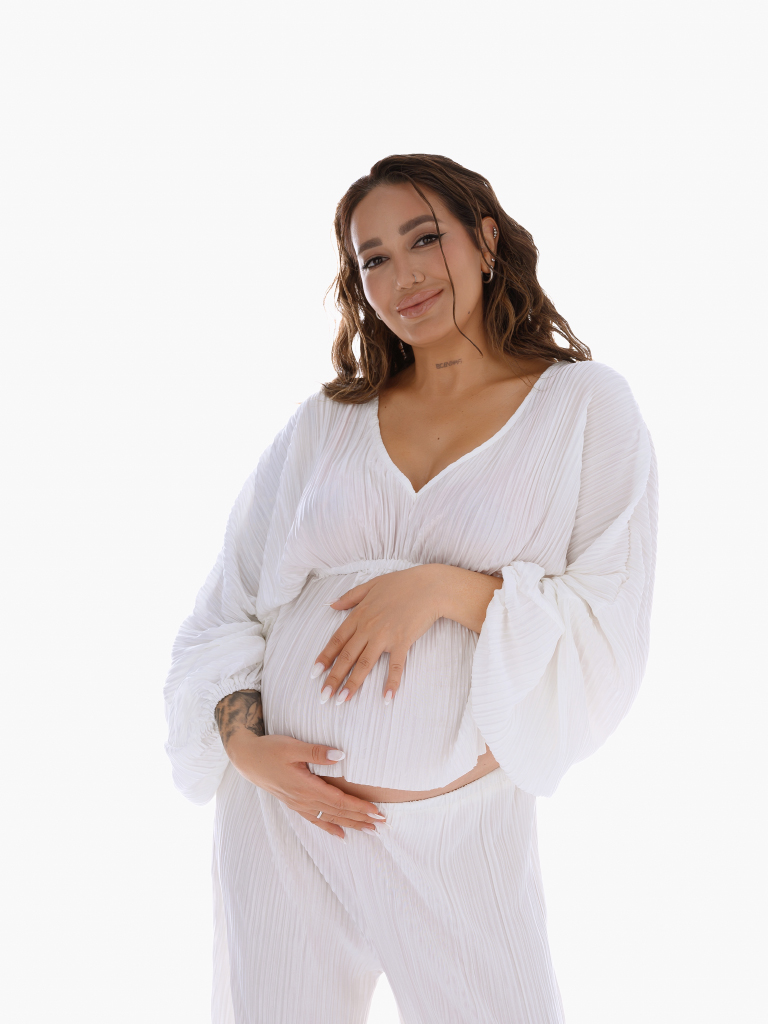 Второй образ — минималистичный и воздушный. Белый на белом — символ чистоты, покоя и внутреннего света. Здесь особенно чувствуется спокойствие и мягкость будущего материнства.